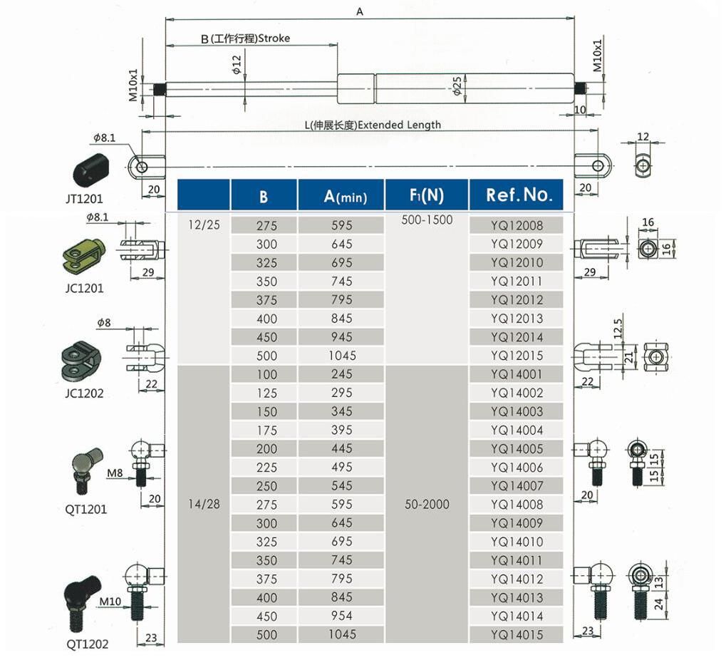注:由于氣彈簧是非標(biāo)準(zhǔn)的,以上僅為型號的一部分。我們可以根據(jù)客戶的要求定制。