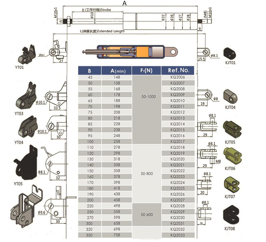 注:由于氣彈簧是非標(biāo)準(zhǔn)的,以上僅為型號(hào)的一部分。我們可以根據(jù)客戶的要求定制。